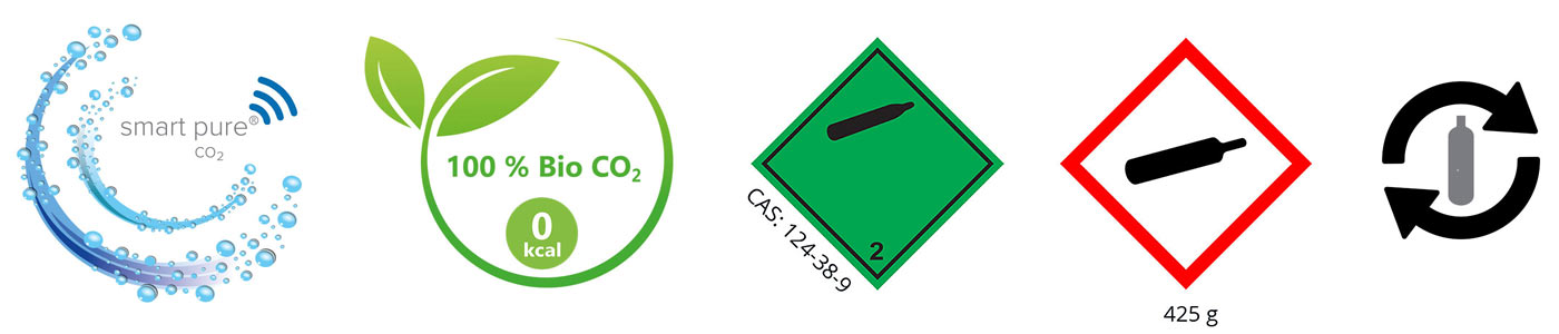 Med vores Smart Pure® CO₂-flasker kan du altid nyde frisk, ren og perlende danskvand. Én flaske på 425 g rækker til op til 75 liter danskvand. Smart Pure®-flaskerne produceres i Tyskland efter de højeste kvalitetsstandarder og er fri for olieholdige produktrester. Det sikrer en behagelig, naturlig og ren smag. Emballagen er lavet af 100 % genanvendt materiale og er egnet til flere forsendelsescyklusser.